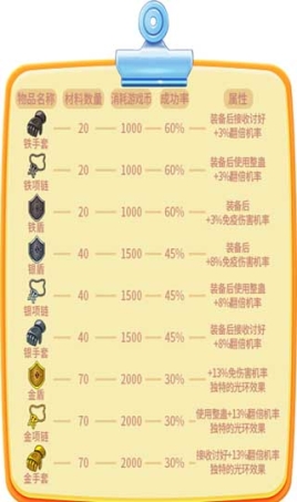 合成装备需要消耗“水晶”,装备合成失败,则退还部分水晶,已花费的游戏币不进行退还。各个装备所需水晶、游戏币根据装备属性不同而不同,详情如下: