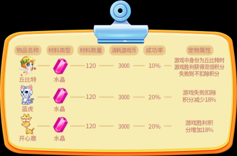 备注:通过“魔法石碎片”合成的“宠物”将在每次限时活动中,展示其在合成时所需碎片、游戏币数量及成功率,敬请关注!