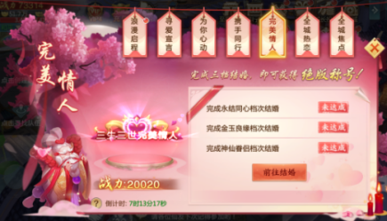 上仙达到213级开启仙缘,即可参与本活动,完成三挡结婚,即可获得绝版称号“三生三世完美情人”