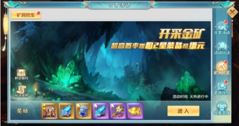 矿洞在每天的9:44-24:00时段开放,期间不定时刷新各种品质的矿石;采之可获得仙盟积分与宝箱奖励;矿石的品质越高,奖励也会越好喔!采矿时会遇到爱捣乱的魔物,将其击败可获得奖励。
