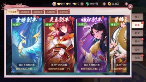 ◆ 材料副本包括灵玉、坐骑、灵宠、坐骑、魂环、背饰副本,分为简单、普通、困难、噩梦、地狱难度,每关进入有对应建议战力和等级限制;