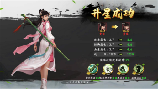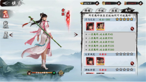 可能有人会觉得侠客升星和侠客进阶是同样重要的环节,没错,确实是,升星可以提升侠客技能效果(随星级提升效果提升数不同)但侠客升星是一个靠运气的事情,招募不到足够的侠客碎片,一切都是空谈,概率问题不多说,就看大家的手气~(升星过后还有升品,同样是提升技能效果)