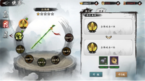 开头就讲过很重要的一点:侠客品质及侠客等级是一切的基础,比如侠客的专武模块,没有等级做基础(42级开启)是无法提升武器品质的,在侠客的专武模块中,不仅可以提升武将自身的属性,还有几处可以提升全体的属性(如下图黄蓉的打狗棒,随等级开启更多的强化选项,每个选项强化的项目也都不同),对单个侠客以及整支队伍都有着极高的加成,但这一切的基础就是玩家等级以及侠客等级。