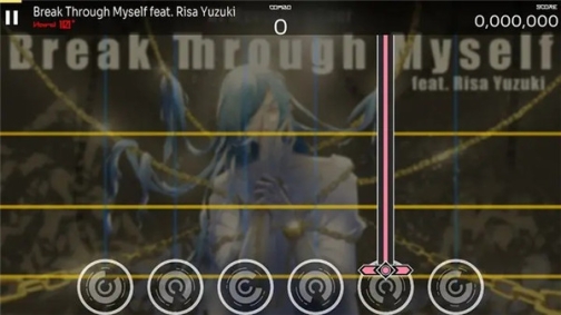 6、进入游戏后操作很简单,和平时玩的音乐游戏很像,音符分为三种蓝色单击一种,红色长条一种,黄色滑键一种,双押变成橙色;