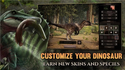 解锁皮肤并更改恐龙的颜色和标记。您可以选择更亮的颜色来从您的背包中脱颖而出,或者使用迷彩与周围环境融为一体。完成任务以解锁新的战斗能力,如断骨尾击、流血的爪子和毒液咬伤!创造一个你独一无二的角色!