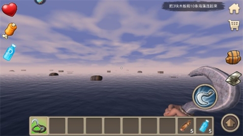 2、游戏中我们可以看到,海面上会随机漂浮着很多木箱,这些木箱里面都有各自资源材料,我们要想办法将这些木箱捞起来作为前期生存的资源。