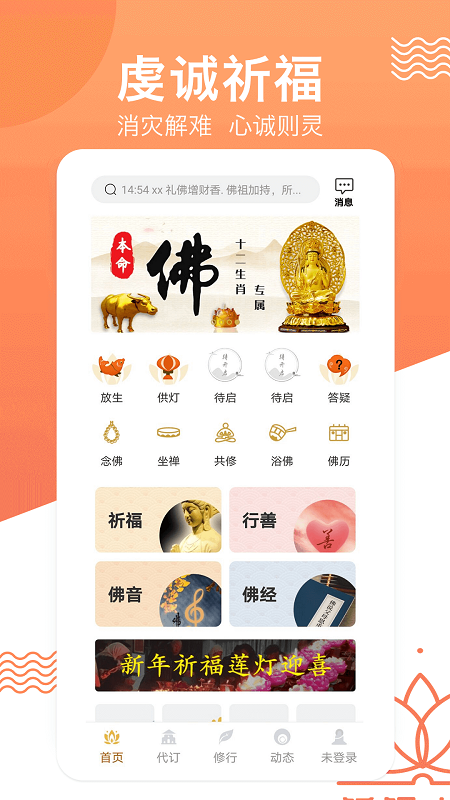 1、在首页中更加便捷的进行拜佛祈福,消除自己的生活劫难,在线进行修行