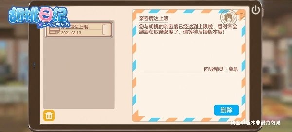 每个亲密度等级都关联着一个尚未解锁的新功能。随着亲密度的提升,您可以解锁更多互动玩法。例如,当亲密度达到4级时,就可以与胡桃进行聊天;若亲密度升至6级,则可以给胡桃安排大家期待已久的打工任务(将打工卡放入她的包包里,她或许就能通过工作赚取一些零用钱);而当亲密度达到7级时,您可以在便利店购买小游戏卡带,与胡桃一决高下,看看谁是真正的游戏高手!