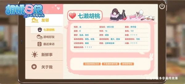 《胡桃日记》,又名《胡桃日记相伴初心》,是一款深受玩家喜爱的角色互动陪伴游戏。该游戏采用了二次元日系画风,让玩家能够与从小一起长大的主角七濑胡桃共同居住在同一屋檐下,一同生活、互相陪伴。在游戏中,玩家可以通过点击角色来进行聊天、喂食等多种互动,以此来提升与角色之间的亲密度。