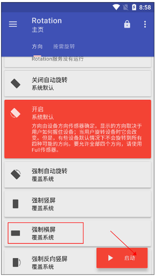 4、比如你要利用Rotation软件进行强制横屏,那么点击下“强制横屏”,再点击“启动”。