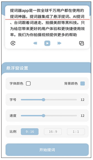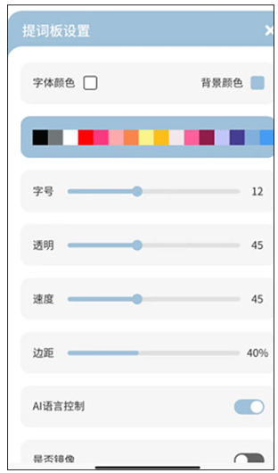 2、提词板模式设置:支持全屏提词、Ai智能语音提词、横屏旋转、字体及背景颜色调节等
