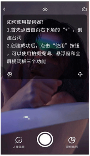 3、拍摄提词开启Ai智能语音即可体验台词跟着语速走,还有美颜效果自动调节美白与磨皮效果,视频比例设置(橫竖屏等)。