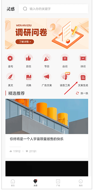 1、打开文案狗2024官方版,在灵感界面中点击文案生成