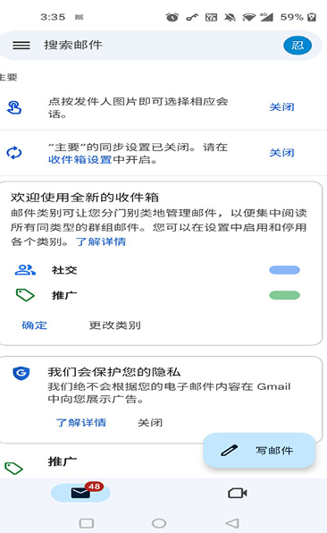 社会和促销信息分成类别,所以你可以阅读从朋友和家人第一消息。