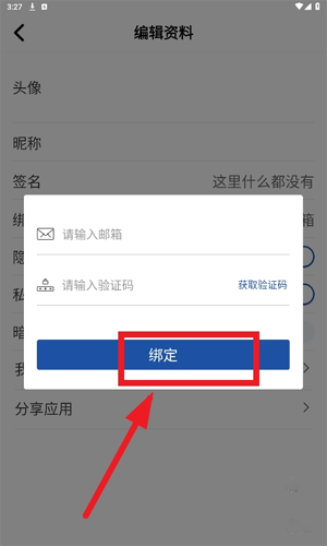 3、接着,输入您的邮箱地址,并输入接收到的验证码,然后点击“绑定”按钮。