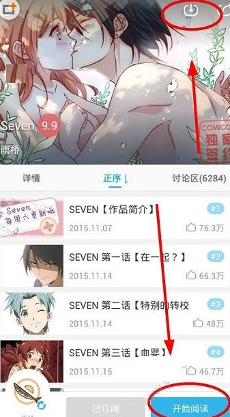 4、进入“seven漫画”阅读界面,点击“开始阅读”,可以在线阅读漫画;点击“下载按钮图标”,进入缓存页面;