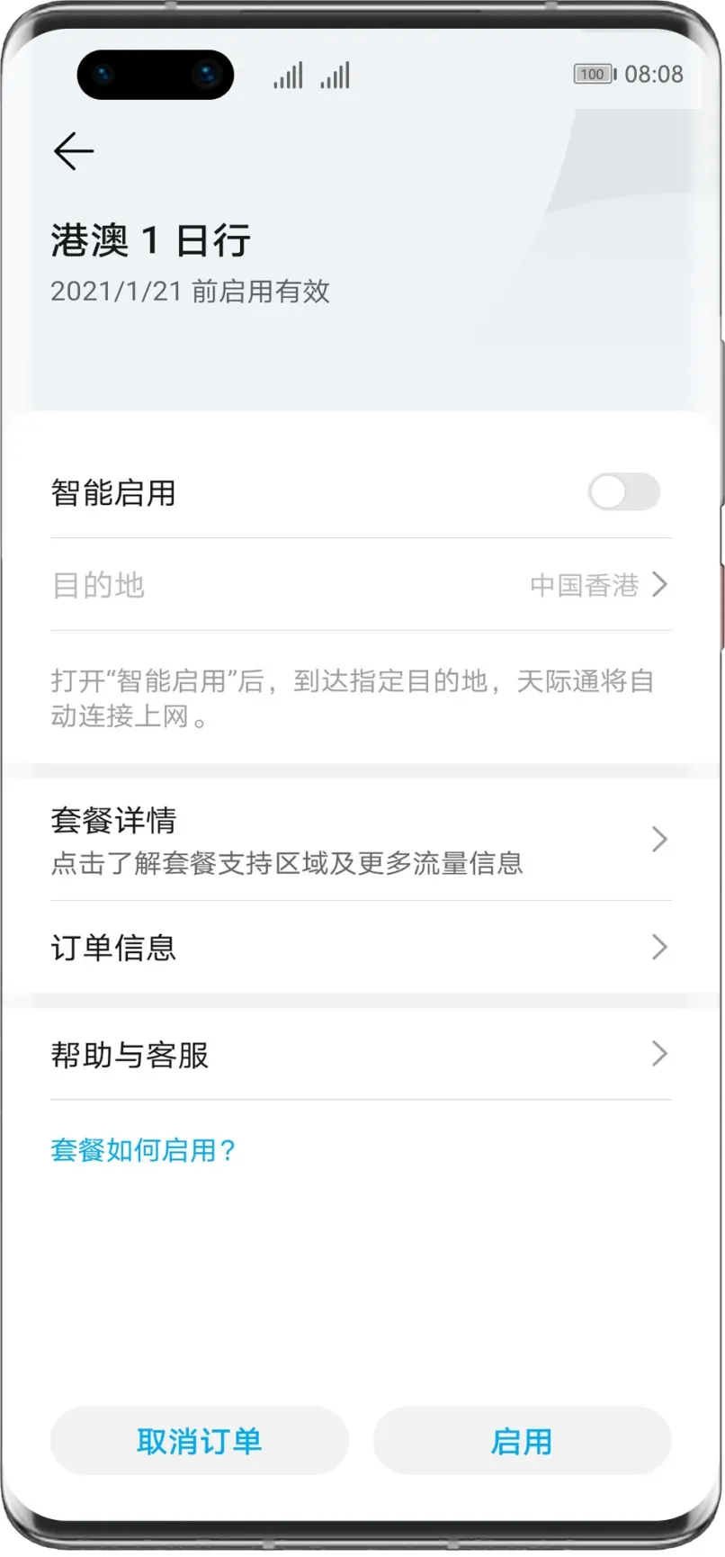 您可以通过开启智能启用并设置目的地,来指定套餐在哪里自动启用联网。