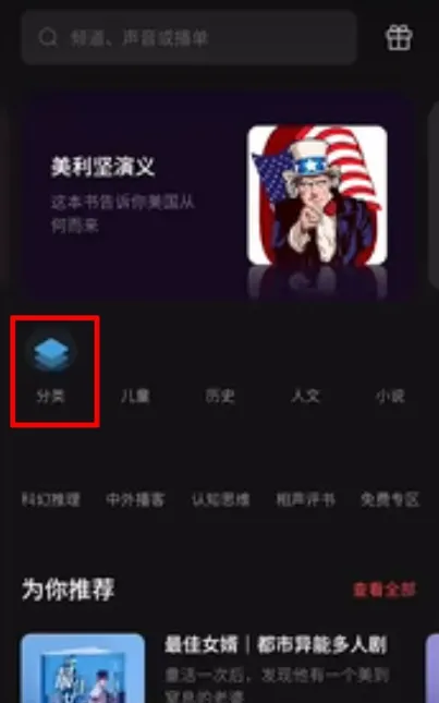 1、打开并登录软件后,进入页面中点击【分类】(下图红色方框区域内),或者通过在顶部搜索框中输入“音乐”直接搜索