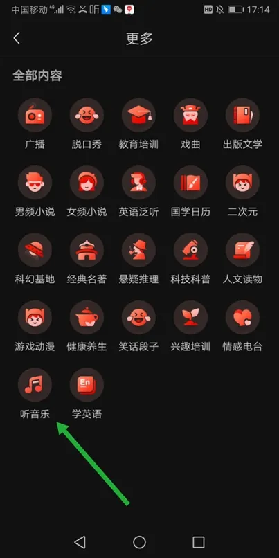 2、在打开的新页面中点击【听音乐】(下图绿色箭头所指)