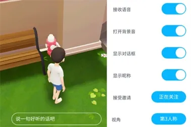 3、点击右上角的“设置”图标,我们就会获得一个设置功能列表,包括了接收语音、打开背景音、显示对话框、显示昵称、接受邀请等,大家可以根据自己的实际情况进行开启或关闭。
