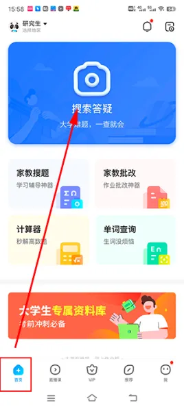 1、登陆进去后点击中间部分靠上处的拍照按钮,选择拍照搜题。