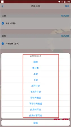 3、页面下方弹出了一系列的批量操作下拉,如果你是想添加商品的话,那么你就要选择上架操作,让商品在app主页面上显示出来。