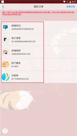 2、在这个界面中选择“我的订单”,我的订单一共分为视频栏位、电子发票、店铺装修、线下服务、印简单等几个模块;