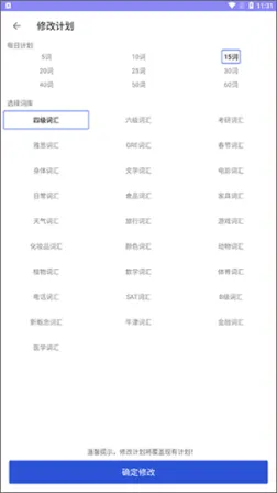 2、根据自身的需求,选择每日背词量和词库,选择完成后,点击【确认修改】即可。