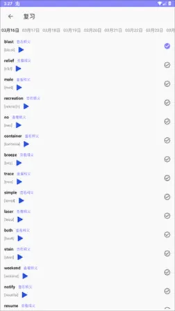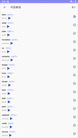2、进入背单词页面,你可以查看单词的释义以及读音,记住之后就可以勾选【√】按钮。