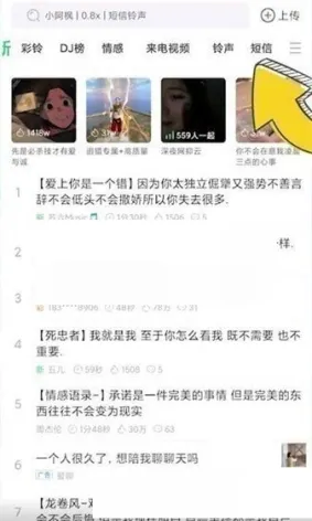 音乐、情感、语录、口白、Mc、电音、DJ、串烧舞曲、火热的抖音短视频原声铃声、彩铃(炫铃)统统打包送给你。火热手机铃声、经典老歌、个性Diy彩铃(炫铃)……快来看看大家都在搜什么吧。