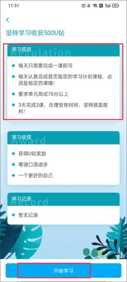 2、了解学习的规则、收获,当你学习过后就会有记录,点击“开始学习”。