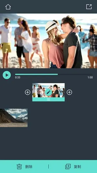 删除或复制:长按住视频片段,手机屏幕下方出现“删除”和“复制”两个选项,将视频拖到相对应的框内,便可实现“删除”或“复制”操作。