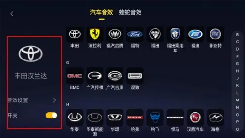 2、进入音效设页面,选择你的车型,可以根据你的车型使用音效