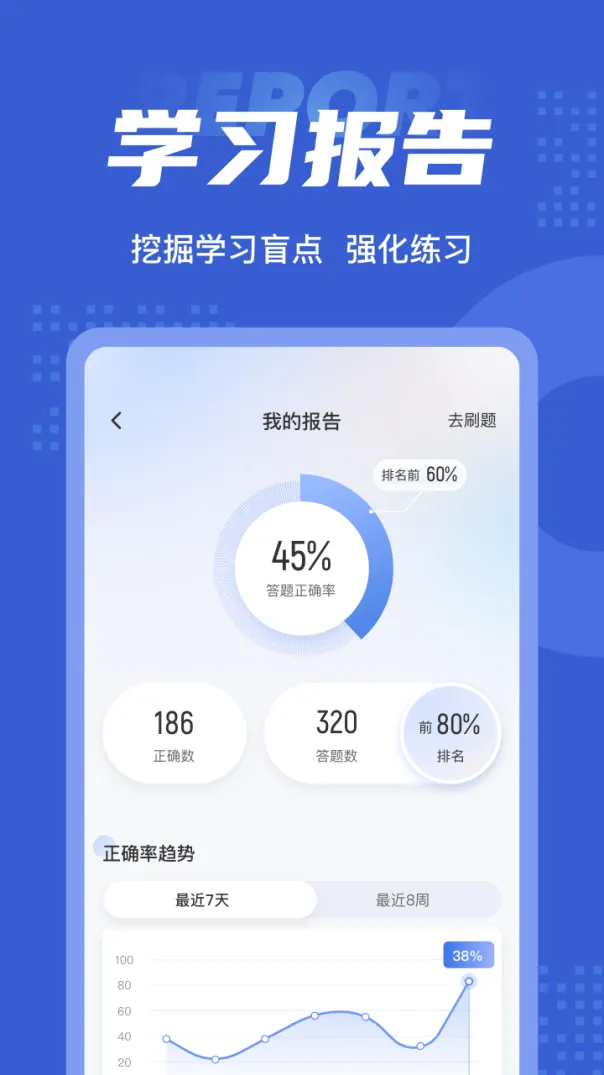 答题统计和分析:应用提供答题统计和分析功能,可以记录用户的答题情况和成绩,并生成相应的统计报告和图表。用户可以通过分析报告了解自己的弱点和进步方向,有针对性地进行学习和复习。