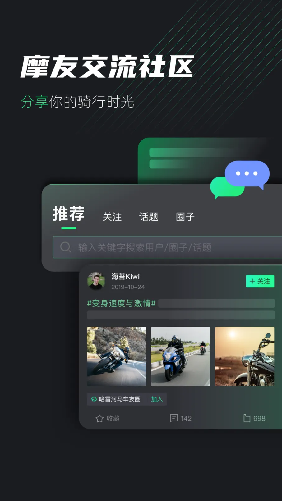 【摩托车社区】 共同分享和探讨骑行的乐趣、车辆的问题、专业评测,让摩托车爱好者结识志趣相投的朋友。 【车联网】 随时查看车辆定位、骑行轨迹、历史停留点、骑行数据以及每日骑行报告。 【车主服务】 通过一个应用程序解决车辆违规查询、驾照分数查询、保单查看、加油优惠获取、油耗计算及周边服务。 【个人中心】 及时接收车辆预警信息和社区互动通知。