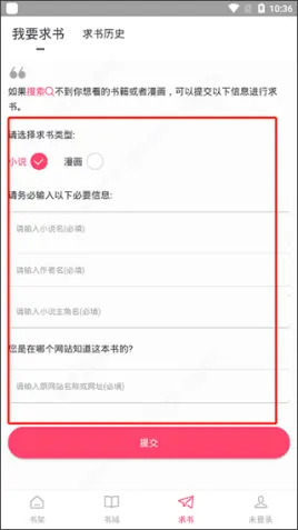4、而且当你找不到你想看的小说或漫画还能在线对其进行求书,十分强大;