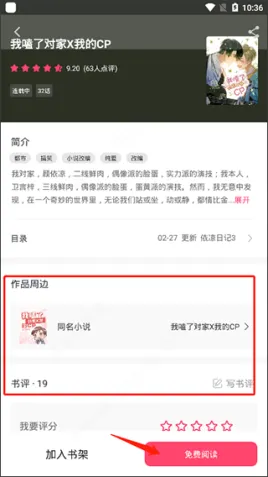 5、另外看到你感兴趣的即可单击进入书籍详细页面查看详细,并在这里不仅可以免费阅读,还能查看到作品周边内容;
