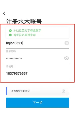 3、输入自己设置的账号和密码,填入正确的手机号,点击开始验证按钮,下一步。