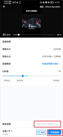 2、然后在视频界面中将输出设置完成后,点击开始压缩即可