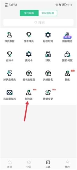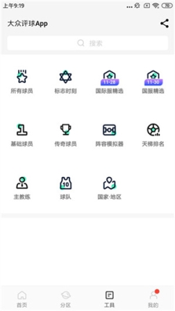 1、首先进入大众评球app,点击工具,点击所以球员;