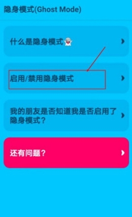 4、点击隐身模式(点击联系我们,点击联系我们,点击提问,点击发现Zenly)如下图,看到启用/禁用隐身模式
