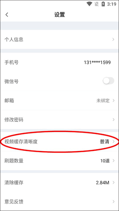 进入设置界面可以看见很多对我们使用这款软件都很有帮助的功能,例如修改密码、个人信息、设置刷题数量等功能,这个时候我们就点击刷题数量上面的视频缓存清晰度。
