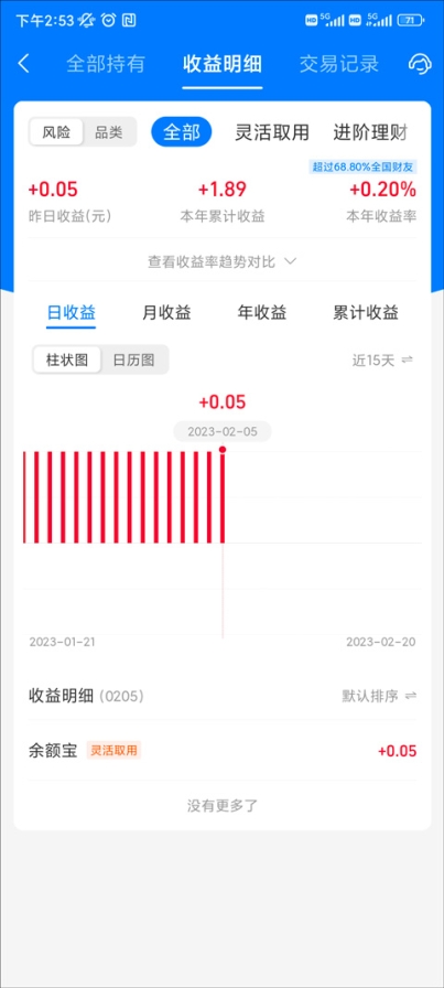 3、在我的资产详细中可以看到全部持有、收益明细、交易记录等等;