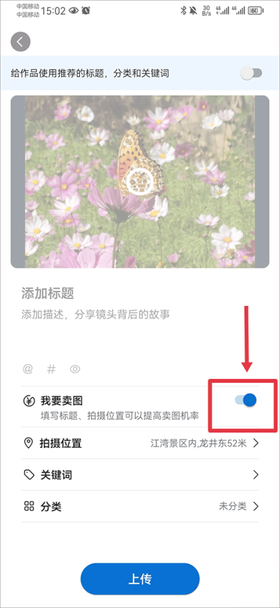 4、点击后会跳转至相册,在相册中选择你要上传的图片和视频,选择完成后在上传作品前将我要卖图开启并点击上传即可