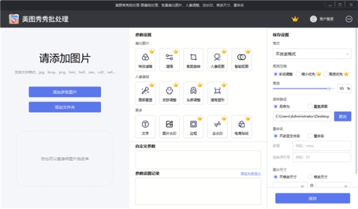 5、导入图片后就可以进行批处理添加特效滤镜、批量增强光效、批量裁剪旋转、批量人像抠图和智能抠图、批量人像美容、批量加文字、加水印、加边框、去水印和加电商贴纸,还可以批量保存和修改尺寸、画质压缩