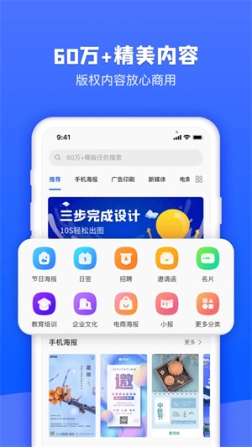 一键制作海报、壁纸、logo、邀请函、喜报、战报、贺报、日签(早晚安)、表情包、头像、GIF动图、传单名片、易拉宝、菜单优惠券、展架、封面、营销长图、电商banner、朋友圈配图、公众号封面、贺卡请柬、个人简历、婚礼邀请函、微商电商宣传、招生培训、开业活动、产品介绍、总结报告等,满足您不同场景的各类设计需求。