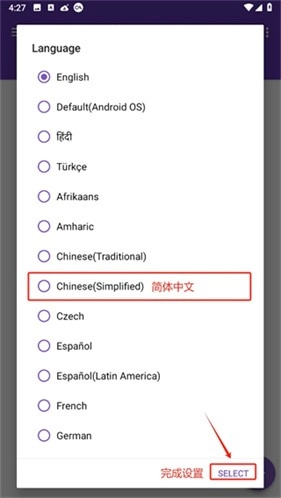 1. 首次启动会跳语言选择,直接勾【Chinese(simplified)】点完成。