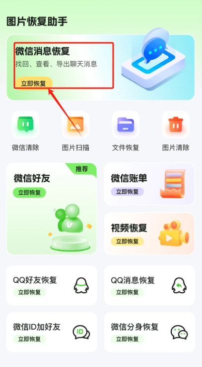 下载安装软件后打开,首页选择恢复类型如微信图片。点击扫描按钮开始自动搜索。