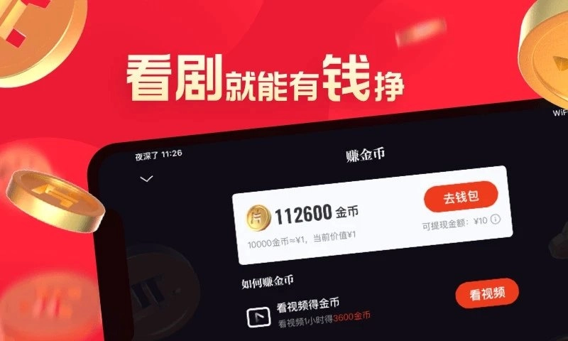 金币兑换现金秒到账。满3万金币兑1元微信零钱,每天最多提现5次。分享剧集给好友得3000金币/人,新用户注册再送5000。每天签到金币翻倍涨,连签7天额外开宝箱。