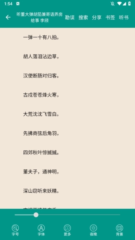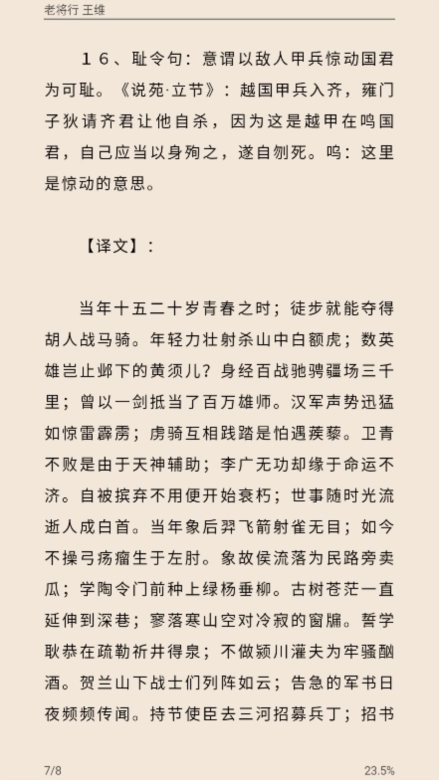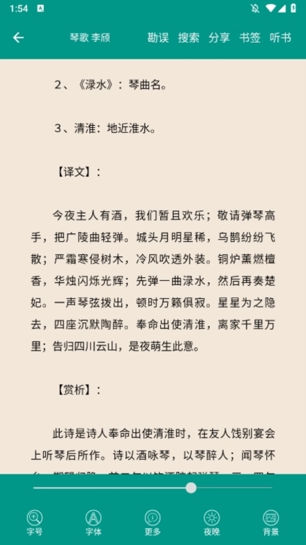 2. 点击诗词标题进入详情页,阅读原文、注释和赏析,调整字体优化体验。